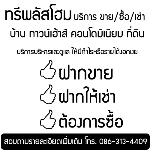 ดูแลให้คุณ สะดวกและรวดเร็ว เหนือยกับการตอบข้อมูล งานประจำยุ่งมากไม่มีเวลาพาคนสนใจไปดูสถานที่ "ให้ทรีพลัสโฮม ดูแลค่ะ" สนใจให้ทรีพลัสโฮม ดูแล ติดต่อได้ที่เบอร์ 086-313-4409 หรือ Email: