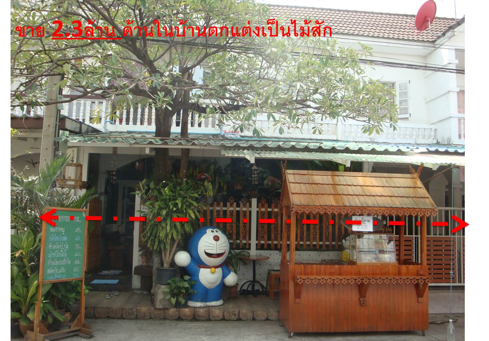 ด้านหน้าบ้านตกแต่ง มีตุ๊กตาโดเรม่อนแถม(เป็นตู้ไปรษณีย์ขนาดสูง 150 เซ็นติเมตร)