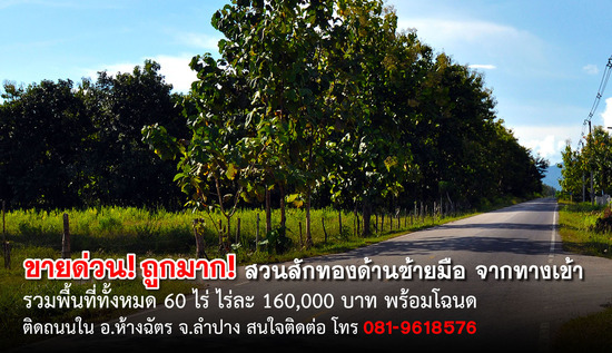 สวนสักทองพร้อมโฉนด 60 ไร่ ต้นสักหมื่นกว่าต้น อยู่ในเขต ต.หนองหล่ม อ.ห้างฉัตร จ.ลำปาง ขายถูก ขายด่วน ไร่ละ 160,000 บาท (หนึ่งแสนหกหมื่นบาทถ้วน) โทรนัดพาไปดูได้ที่ 081-9618576