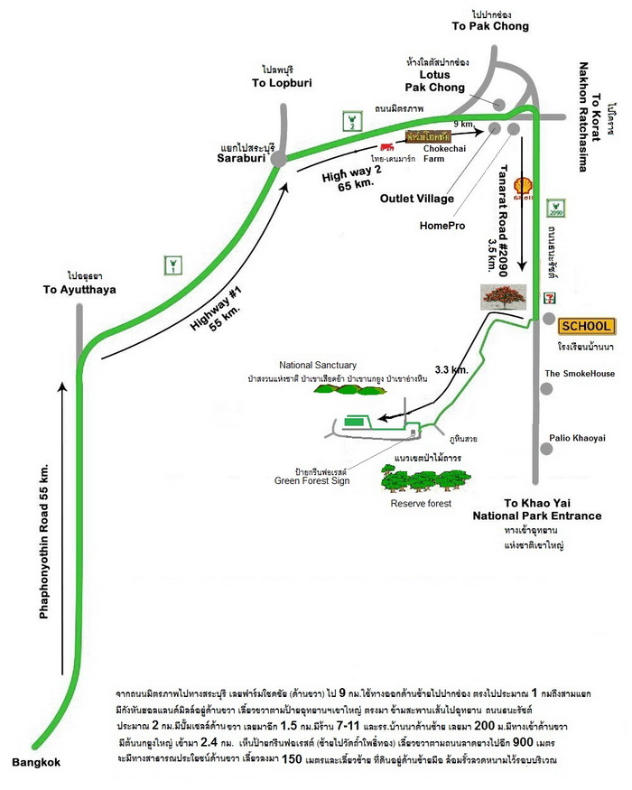 Take Highway 2 (Mitraparb Road) where sign posted to Saraburi. From Bangkok city centre, it takes around 1hr40min. to bring you near Chokechai Farm (on your right), 90 miles away from Bangkok.