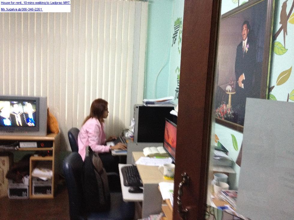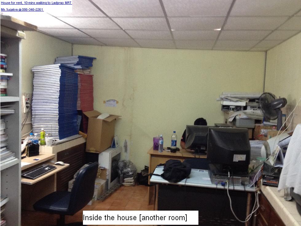 บ้านเดี่ยวน้ำไม่ท่วม ติดรถไฟฟ้าใต้ดินลาดพร้าว ทำเลดีมาก ให้เช่าทำ Home Office 49,000 บาท/เดือน – บ้านเดี่ยว 2 ชั้น ขนาดใหญ่ – MRT ลาดพร้าว เดิน 10 นาที – บนที่ดิน 104 ตารางวา – พื้นยกระดับ ตกแต่งด้วยหินอ่อน – จอดรถได้ 4 คัน 5 ห้องน้ำ 7 ห้องทำงาน – ใกล้แยกรัชดา ลาดพร้าว – ซอยลาดพร้าว 25 – น้ำไม่ท่วม – ปากซอยมี ธนาคาร KBank, TMB, SCB, 7-11, ปั้ม PTT และ Amazon Cafe – พร้อมย้ายเข้า 1 พฤษภาคม 55 ดูรูปบ้านเพิ่มเติม: http://www.facebook.com/HouseMRT Sugalya เจ้าของบ้าน โทร 086-3462261