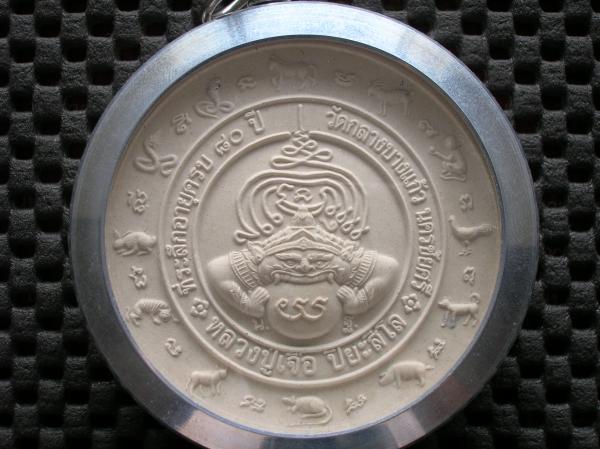 เหรียญบาตรน้ำมนต์ เนื้อผงพุทธคุณ ที่ระลึกอายุครบ ๘๐ ปี หลวงปู่เจือ ปิยะสีโล ด้านหลังพระราหูอมจันทร์ และล้อมรอบด้วย ๑๒ ปีนักษัตร เข้ากรอบอลูมิเนียมกลึงสวยงามงานปราณีต สามารถถอดเปลี่ยนได้