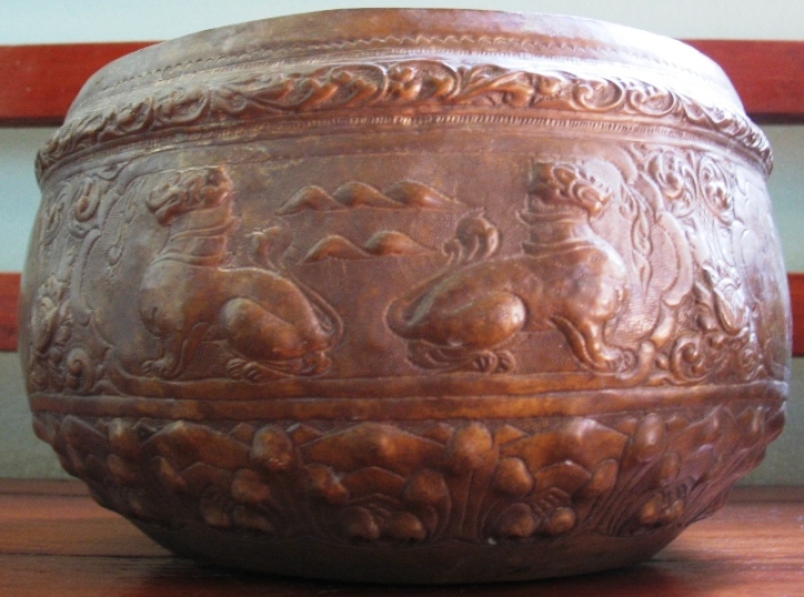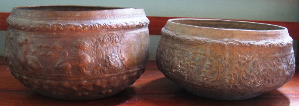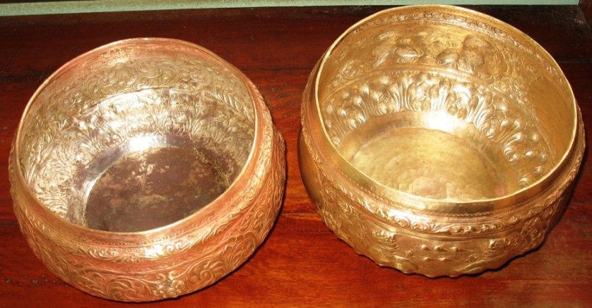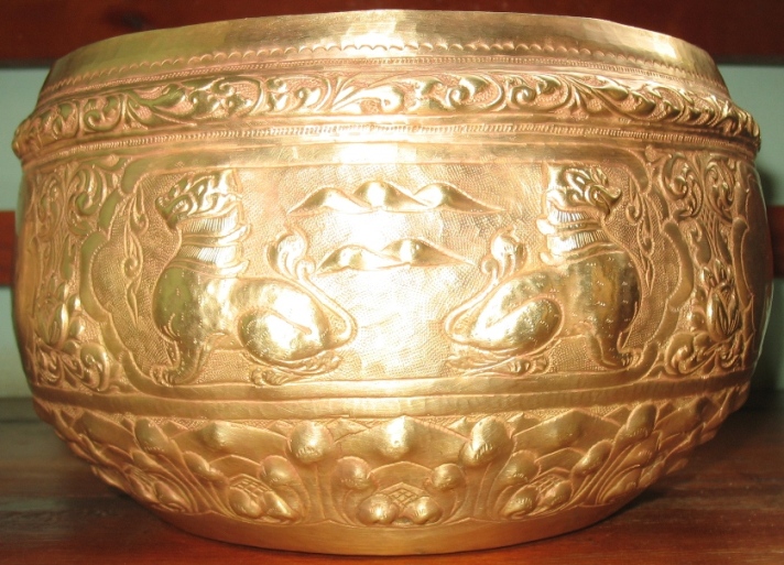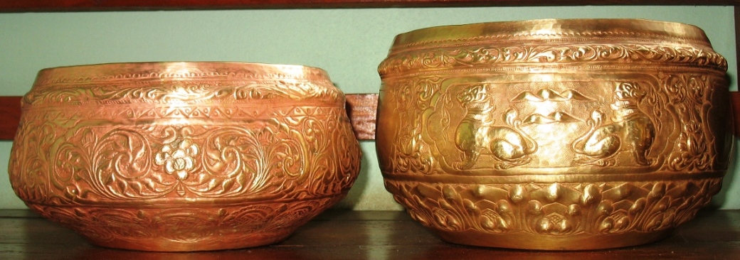 เป็นงานขึ้นรูปจากแผ่นทองเหลืองแล้วตีและตอกลายด้วยมือ ลวดลายปราณีตสวยงามครับ