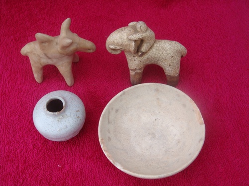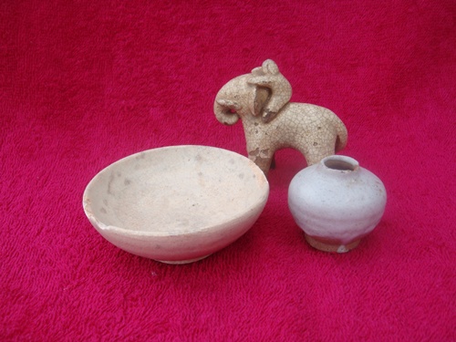 ขวด ถ้วย สังคโลก ศิลปะสมัยสุโขทัย ดินเผาเคลือบขาว ศตวรรษที่ 20-21 ไม่มีลวดลาย สภาพสมบูรณ์ ของแท้ 100%หายากมาก ราคา 1,300 บาท/ชุด (ขวด กว้าง 4 cm. สูง 3.6 cm./ ถ้วย กว้าง 7.7 cm. สูง 3 cm.) (ตุ๊กตาช้าง วัวขายแล้วครับ)