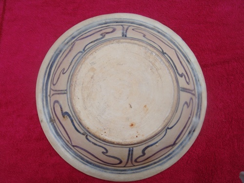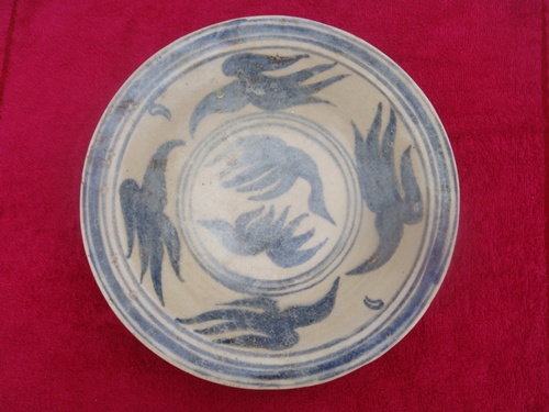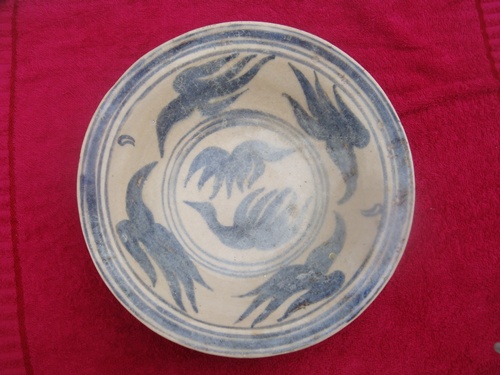 จานโบราณเวียงกาหลง ศิลปะสมัยล้านนา ดินเผาเคลือบใส ศตวรรษที่ 21-22 เส้นผ่านศูนย์กลางยาว 23.7 cm. สูง 4.5 cm. ในจานเขียนลายสีน้ำเงินอมดำนกกา 6 ตัว ในวงกลม 2 ชั้น สภาพสมบูรณ์ แตกลาน ของแท้ 100%หายากมาก ราคา 5,500 บาท