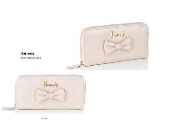 Harrods Elliot Patent Purse (Rose) Elliot purse Matching bow accents front Harrods signature detail Zip closure 2 receipt/ note slots, 8 card slots Interior zip compartment 100% PVC with polyester lining H10cm x W20cm x D2.5cm Wipe clean