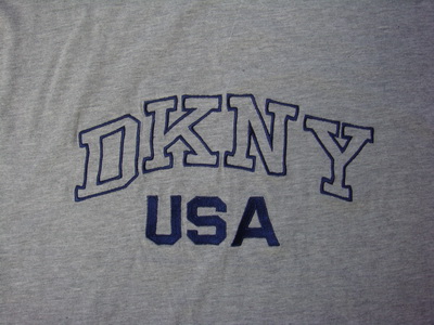 ขายเสื้อคอกลมแขนยาวDKNYสีเทาแขนสีดำ ไซส์ L Made in USA ที่อกปักโลโก้DKNY