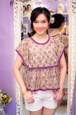 เสื้อชีฟองลายในตัว กุ๊นขอบม่วง และขอบชมพู ลายดอกไม้ระบายซ้อน 2 ชั้น ไม่บาง...