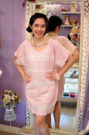 เดรสสั้นผ้าลินินเกาหลี สีชมพูลายจุด...