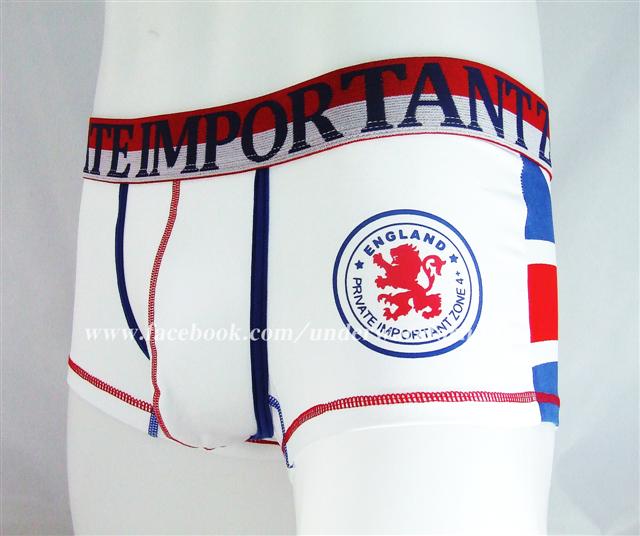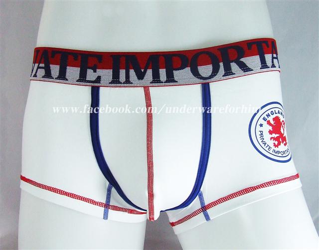 กางเกงในชาย PRIVATE IMPORTANT บ๊อกเซอร์ Brief รุ่นสีขาวแต่เก๋ ตรงมีสัญญาลักษณ์สิงโตคำรามของอังกฤษสีแดงตรงขาซ้าย และด้านหลังเป็นรูปธงชาติอังกฤษ