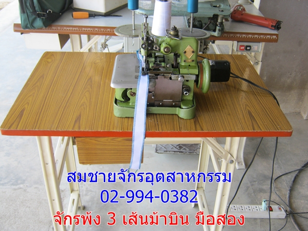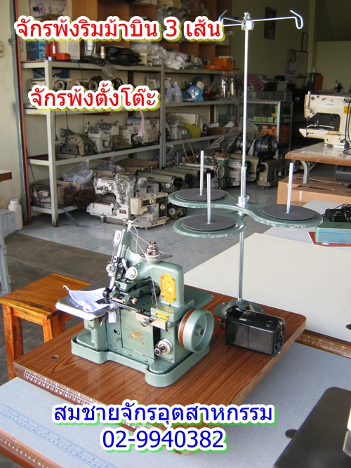 จักรพ้งม้าบิน 3 เส้น แบบตั้งโต๊ะ ใช้มอเตอร์ไฟฟ้า สามารถยกไปตั้งทำงานได้ทุกสถานที่ เคลื่อนย้ายสะดวก ใช้พ้งเก็บริมงานผ้าทั่วไป