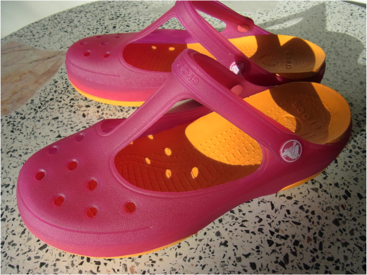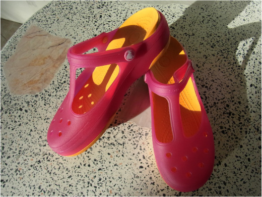 รองเท้ายี่ห้อ 'Crocs' สีชมพูบานเย็นตัดกับสีส้ม