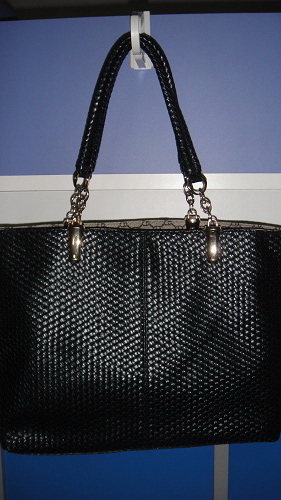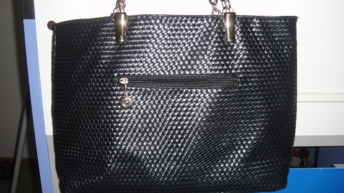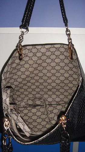 กระเป๋าหนังสีดำมีลายในตัว ขนาด 11*16 นิ้ว ด้านในมีลวดลายสีน้ำตาลอ่อน สามารถพลิกมาเป็นลายด้านนอกได้ มีตัวลูกกระเป๋าข้างในถอดได้ มีสายสะพายแยกต่างหาก