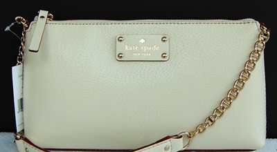 กระเป๋าสะพาย KATE SPADE หนังอย่างดีสีขาวครีม ด้านหน้าติดตรา KATE SPADE ให้เห็นเด่นชัด สายทั้งสองข้างเป็นโซ่สีเงิน แล้วเชื่อมด้วยหนังสีเดียวกับตัวกระเป๋า