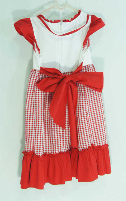 ชุดเดรสลายสก็อตสีขาว-แดง ช่วงอกมีผ้าสีขาวคล้องคอดูเก๋