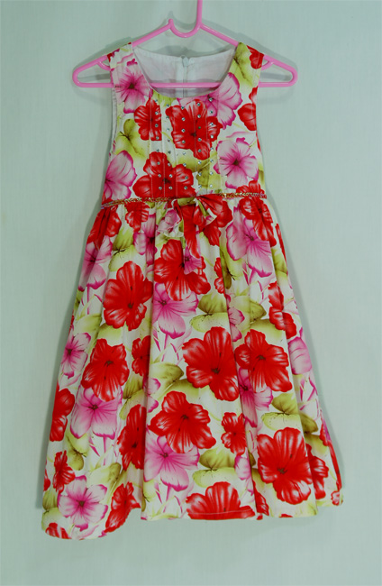 ชุดเดรสลายดอกไม้โทนสีแดง-ชมพู ชุดคอกลม แขนกุด ช่วงอกติดเพชรเทียม