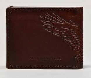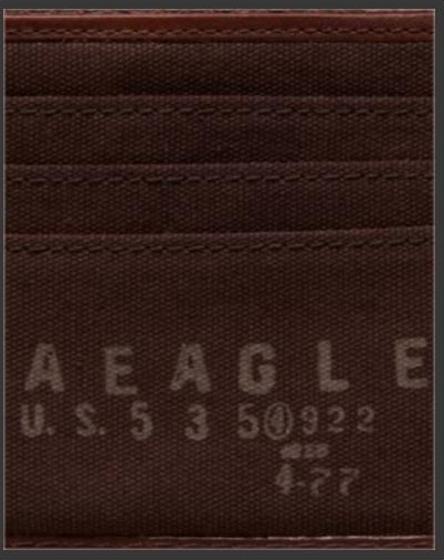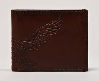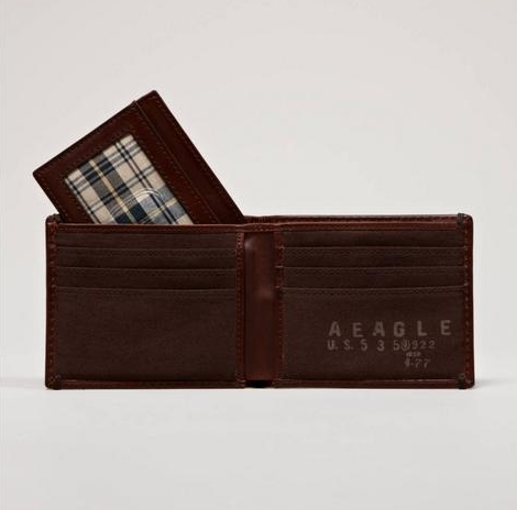 กระเป๋าสตางค์ผู้ชายแบรนด์ AMERICAN EAGLE เป็นกระเป๋าหนังสีน้ำตาลเข้ม ด้านนอกพิมพ์ลาย Eagle สัญญาลักษณ์ของอเมริกา ใส่บัตรเครดิต เอทีเอ็มได้ 8 ใบ (รวมที่ใส่บัตรแบบแยกส่วนได้)