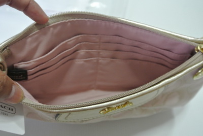 เมื่อรูดซิปดูด้านใน จะพบว่าบุด้วยผ้าสีชมพูโทนเดียวกับด้านนอก มีช่องสำหรับใส่บัตรเครดิต เอทีเอ็ม ได้ถึง 8 ช่อง ใส่ Iphone หรือ BB ได้สบายเลยคะขนาดใหญ่กว่ากระเป๋าสตางค์คล้องแขนทั่วไป จุของได้เยอะคะ