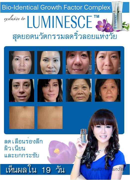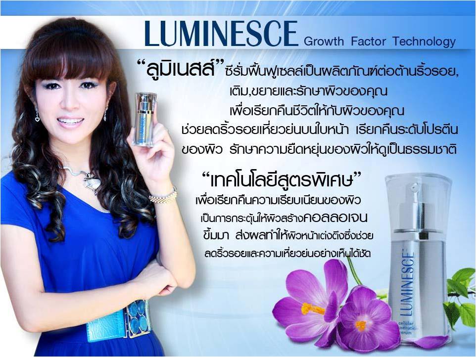 เซลลูลาร์ รีจูวีเนชัน เซรั่ม cellular rejuvenation serum สูตรพิเศษด้วยเทคโนโลยีสิทธิบัตรเพื่อเรียกคืนความกระชับ และปรับสภาพผิวให้เนียนเรียบ ช่วยลดริ้วรอยและร่องลึกที่ใบหน้า พร้อมทั้งเพิ่มความสว่าง กระจ่างใส เซรั่มจะทำงาน แทรกซึมลึกเข้าสู่ผิวชั้นใน เพื่อคืนค่าระดับโปรตีนของผิวให้สมบูรณ์แข็งแรง อย่างที่ผิวสุขภาพดีควรจะเป็น ให้ Stem Cell Growth Factors เป็นอาหารผิวชั้นดีที่จะทำให้เซลล์ผิวแข็งแรงจากภายในสู่ภายนอก ด้วยกระบวนการที่จะทำให้ผิวกลับมาเป็นผิววัยหนุ่มสาวที่คงความสมบูรณ์สูงสุด 100% จากธรรมชาติ เรากล้ายืนยันว่าส่วนผสมทั้งหมด สกัดจากธรรมชาติ ปราศจากสารกันบูด (Paraben) และผ่านการทดสอบการแพ้แล้ว (Hypoallergenic) ด้วยเทคโนโลยีล้ำหน้าล่าสุดที่เพิ่งถูกค้นพบทำให้ LUMINESCE™ เซลลูลาร์ รีจูวีเนชั่น เซรั่ม ได้รับกระแสตอบรับที่ดีอย่างยิ่ง ในฐานะผลิตภัณฑ์ต่อต้านริ้วรอยตัวแรกที่ช่วยเสริมกลไกธรรมชาติของผิวในการฟื้นฟู, บำรุง และสมานผิว เซรัมต่อต้านริ้วรอยอันทรงอานุภาพนี้จะปฏิบัติการตลอดเวลาเพื่อนำชีวิตชีวามาสู่ผิวสวย ถือเป็นการสร้างมาตรฐานใหม่ให้กับวงการความงาม LUMINESCE™ เซลลูลาร์ รีจูวีเนชั่น เซรั่มประกอบด้วยสูตรที่กำลังจดเอกสิทธิ์ โดยส่วนผสมของสารสกัดที่ได้มาจากสเต็มเซลล์เต็มวัยนั้นมีส่วนผสมของ human growth มากกว่า 200 หน่วย ช่วยฟื้นฟูผิวโดยค่อยๆเพิ่มระดับโปรตีนธรรมชาติของผิว ได้แก่ คอลลาเจน และอิลาสติน เพื่อผลลัพธ์ของผิวแลดูอ่อนเยาว์ยิ่งขึ้น, สุขภาพดีขึ้น และเปล่งปลั่งสดใสขึ้น LUMINESCE™ เซลลูลาร์ รีจูวีเนชั่น เซรั่ม มหัศจรรย์แห่งความงามที่นำคุณคืนสู่ความอ่อนเยาว์อีกครั้ง •สูตรส่วนผสมพิเศษด้วยเทคโนโลยีล่าสุดที่กำลังจดสิทธิบัตร ช่วยฟื้นบำรุงผิวให้สวยเปล่งประกาย กระชับ เนียนเรียบ