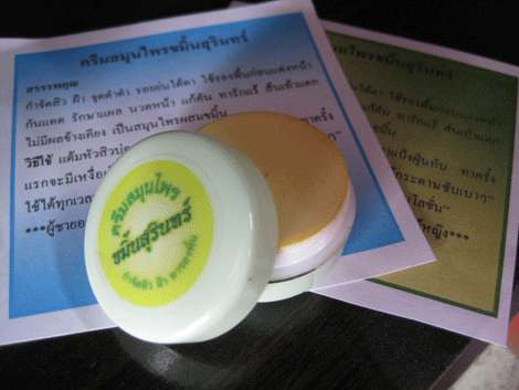 สรรพคุณ กำจัดสิว ฝ้า จุดด่างดำ รอยย่นใต้ตา ใช้รองฟื้นก่อนแต่งหน้า กันแดด รักษาแผล นวดหน้า แก้คัน ทารักแร้ ส้นเท้าแตก ไม่มีผลข้างเคียง เป็นสมุนไพรผสมขมิ้น วิธีใช้ แต้มหัวสิวบ่อย "ทาครีมแล้วทาแป้งฝุ่นทับ ทาครั้งแรกจะมีเหงื่อเล็กๆออกมานิดหน่อย ใช้กระดาษซับเบาๆ" ใช้ได้ทุกเวลา ทุกเพศทุกวัย ถ้าผิวแห้งใช้คู่กับโลชั่น