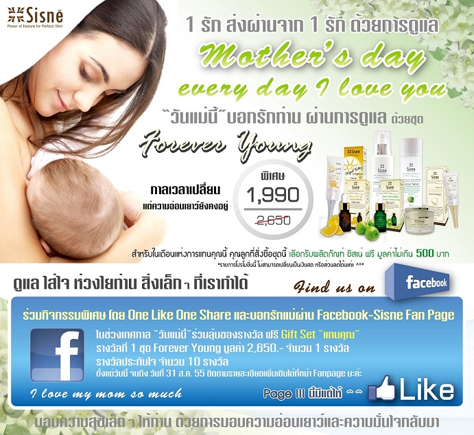 มาร่วมสนุกกันค่ะ "One Like One Share "ในช่วงเทศกาลวันแม่ที่จะมาถึงนี้เพียงแค่กด Like และโพสต์ข้อความบอกรักแม่และผ่านทาง Facebook-Sisne fan page ร่วมลุ้นรับของรางวัล ฟรี!! Gift Set "แทนคุณ" มูลค่า 2,650 บาท ตั้งแต่วันนี้ - 31 ส.ค 2555 นี้คะ(พลาดไม่ได้นะคะ)