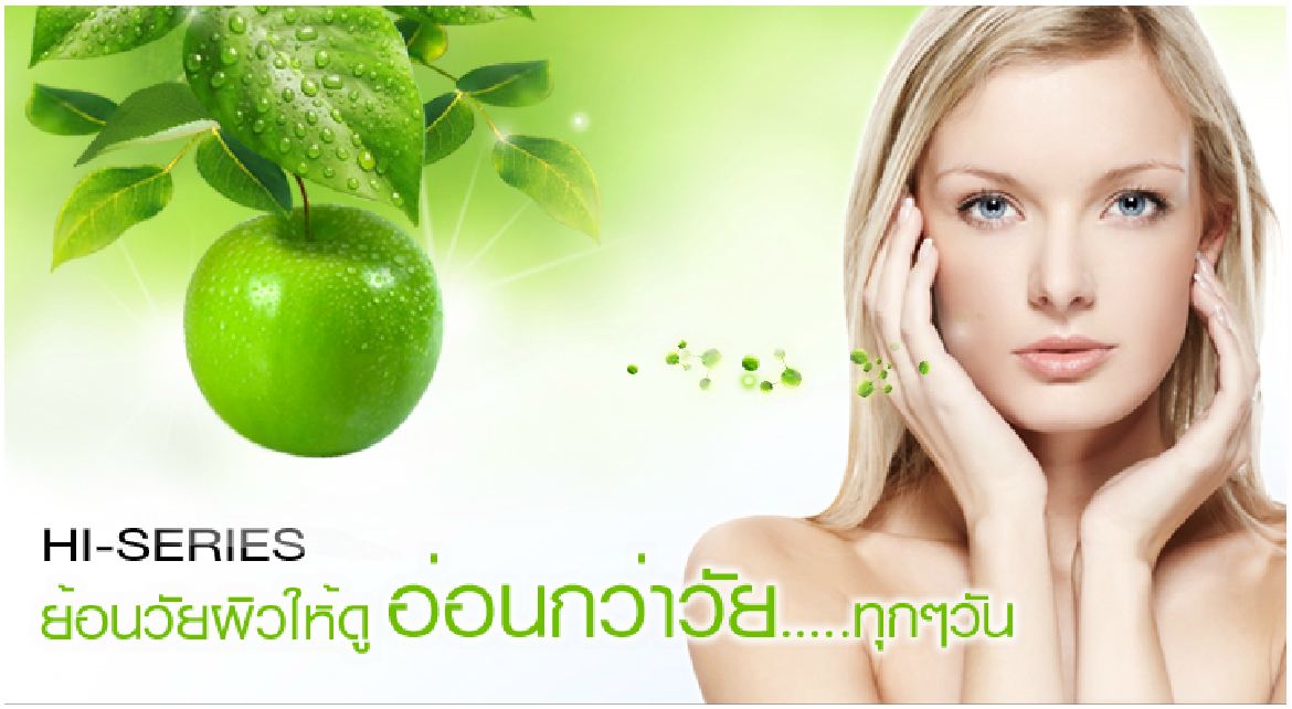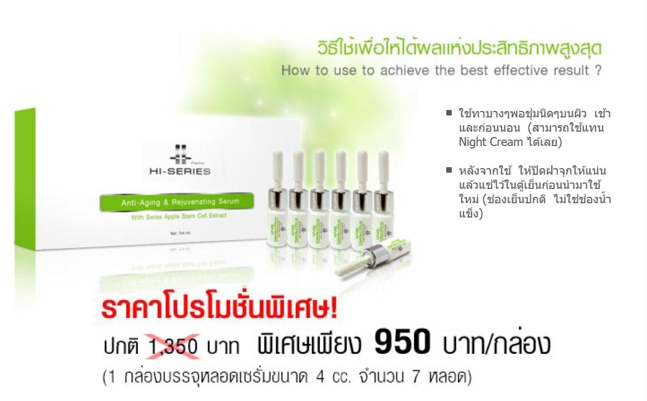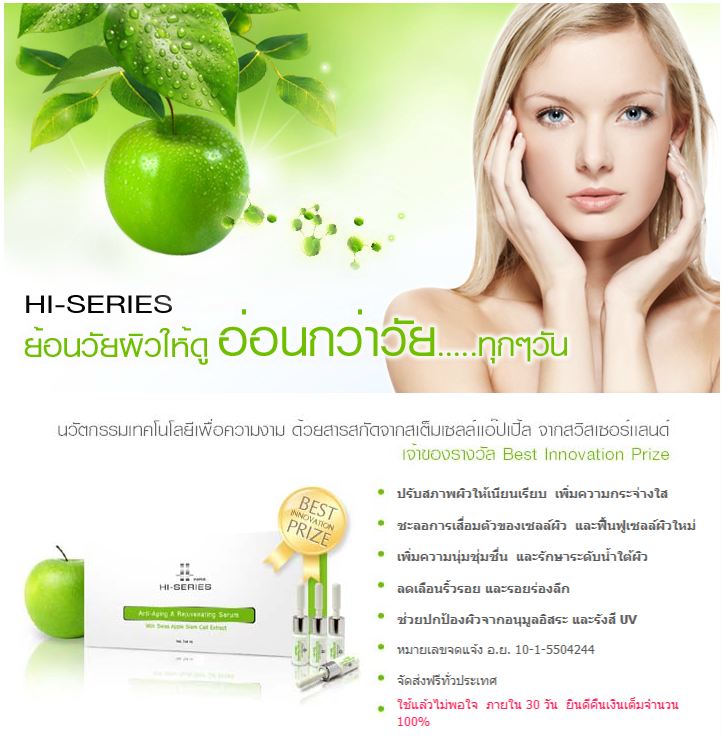 สเต็มเซลล์แอ๊ปเปิ้ลจากสวิสเซอร์แลนด์ เซรั่มบำรุงเข้มข้นสูตรพิเศษในรูปสา รสกัดสเต็มเซลล์แอ๊ปเปิ้ลจากสวิสเซอร์แลนด์ นวัตกรรมบทใหม่สำหรับการดูแลความงามเพื่อฟื้นฟูสภาพผิวให้ย้อนเวลากลับไป เสมือนผิวครั้งวัยเยาว์ อีกระดับของการฟื้นฟูความเยาว์วัยและกระจ่างใสให้กับผิวอย่างแท้จริง นวัตกรรมเทคโนโลยีเพื่อความงาม ด้วยสารสกัด จากสเต็มเซลล์แอ็ปเปิ้ล จากสวิสเซอร์แลนด์ เจ้าของรางวัล Best Innovation Prize ปรับสภาพผิวให้เนียนเรียบ เพิ่มความกระจ่างใส ชะลอการเสื่อมตัวของเซลล์ผิว และฟื้นฟูเซลล์ผิวใหม่ เพิ่มความนุ่มชุ่มชื่น และรักษาระดับน้ำใต้ผิว ลดเลือนริ้วรอย และรอยร่องลึก ช่วยปกป้องผิวจากอนุมูลอิสระ และรังสีUV หมายเลขจดแจ้ง อ.ย. 10-1-5504244 จัดส่งฟรีทั่วประเทศ ใช้แล้วไม่พอใจ ภายใน 30 วัน ยินดีคืนเงินเต็มจำนวน 100% Anti-Aging & Rejuvenating Serum เซรั่มบำรุงเข้มข้นสูตรพิเศษในรูปของ Encapsulation นวัตกรรมบทใหม่สำหรับการดูแลความงามเพื่อฟื้นฟูสภาพผิวให้ย้อนเวลากลับไปเสมือนผิวครั้งวัยเยาว์ อีกระดับของการฟื้นฟูความเยาว์วัยและกระจ่างใสให้กับผิวอย่างแท้จริง ***** ความมหัศจรรย์ ของสารสกัดสเต็มเซลล์แอ็ปเปิ้ล ***** Uttwiler Spattlauberเป็นพันธุ์แอ๊ปเปิ้ลพันธุ์ที่ปลูกมานานในประเทศสวิสเซอร์แลนด์ตั้งแต่ศตวรรษที่ 18 ต่อมามีการค้นพบว่าเป็นผลไม้ที่มีคุณสมบัติที่น่าทึ่งมาก คือ สามารถเก็บไว้ได้นานโดยเหี่ยวย่นช้ามาก ผู้คนในศตวรรษที่ 18 จึงนิยมเก็บเป็นอาหารสำหรับช่วงฤดูหนาว แต่เนื่องจากมันมีรสค่อนข้างเปรี้ยว ในปัจจุบันจึงไม่ได้รับความนิยม ทำให้เป็นพันธุ์ที่หายากมากและใกล้จะสูญพันธุ์แล้วในเวลานี้ Malus Domesica เป็นสารสกัดจากเสต็มเซลล์ของผลแอ๊ปเปิ้ลพันธุ์ดังกล่าวด้วยเทคโนโลยีด้านชีวภาพ PCT Biotechnology ชั้นสูงของ Mibelle ประเทศสวิสเซอร์แลนด์ ในการเพาะเลี้ยงเนื้อเยื่อจากผลไม้พันธุ์หายาก ที่ปราศจากมลพิษและสารฆ่าแมลงโดยสิ้นเชิง และเมื่อนำมาทดสอบ แล้วจึงพบว่า สารสกัดดังกล่าวมีคุณสมบัติ... ช่วยกระตุ้นการสร้างเซลล์ผิวใหม่ ชะลอการเสื่อมตัวของเซลล์ผิวและทำให้เซลล์ผิวมีอายุยืนยาวขึ้น ปกป้องผิวจากการทำลายของรังสี UV แม้ที่ความเข้มข้นต่ำ ส่วนผสมเอกสิทธิ์เฉพาะของ Hi-Series ที่คิดค้นมาเผื่อผิวคุณ นอกจากสารสกัดสเต็มเซลล์จากแอ๊ปเปิ้ลสวิสแล้ว เซรั่มของเรายังอุดมไปด้วยสารบำรุงเข้มข้นอื่นๆอีก อาทิ... ไมโครคอลลาเจน (Matrixyl Micro-Collagen) เมื่อคนเราอายุมากขึ้น ปริมาณการผลิตคอลลาเจนใต้ผิวในชั้นหนังแท้จะลดลงปีละ1.5% ส่งผลให้เกิดริ้วรอยและร่องรอยแห่งการชราก่อนวัย Matrixyl Micro-Collagen เป็นเปปไทด์ชนิดหนึ่งที่มีขนาดเล็กมากๆ พ