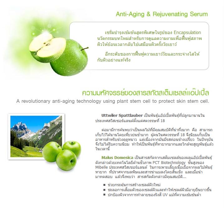 สเต็มเซลล์แอ๊ปเปิ้ลจากสวิสเซอร์แลนด์ เซรั่มบำรุงเข้มข้นสูตรพิเศษในรูปสา รสกัดสเต็มเซลล์แอ๊ปเปิ้ลจากสวิสเซอร์แลนด์ นวัตกรรมบทใหม่สำหรับการดูแลความงามเพื่อฟื้นฟูสภาพผิวให้ย้อนเวลากลับไปเสมือนผิวครั้งวัยเยาว์ อีกระดับของการฟื้นฟูความเยาว์วัยและกระจ่างใส