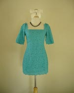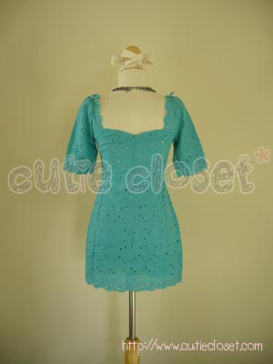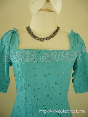 เดรสคอเหลี่ยมแขนตุ๊กตาผ้าลูกไม้สีเขียวน้ำทะเล