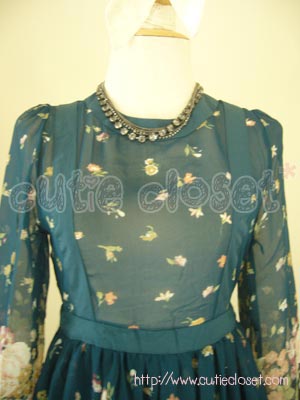 เดรสผ้าซิลค์ชีฟองแขนยาวผูกโบว์ลายดอกไม้สีกรมท่า