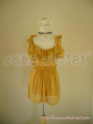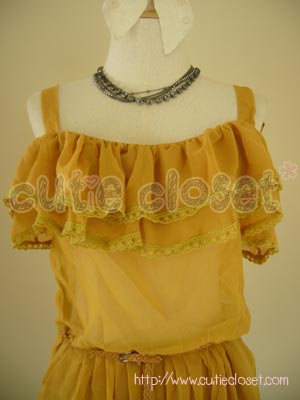 [SALE 40%] เดรสเปิดไหล่ตกแต่งระบายสีเหลืองมัสตาร์ด