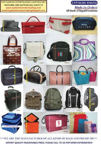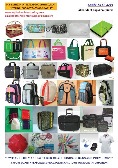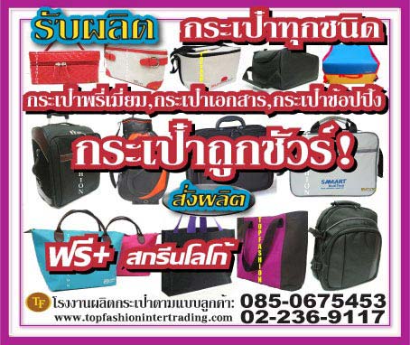 หจก.ท็อป แฟชั่น อินเตอร์เทรดดิ้ง เราเป็นโรงงานผู้ผลิตกระเป๋า,รับผลิตกระเป๋าทุกชนิด,รับทำกระเป๋าตามแบบลูกค้า,รับผลิตถุงผ้าลดโลกร้อน,กระเป๋าผ้า,กระเป๋าแจกงานสัมมนา,กระเป๋าแจกงานอีเวนต์ราคาถูก,กระเป๋าแจกลูกค้า,กระเป๋าธนาคาร,กระเป๋าร้านทอง,กระเป๋าโรงเรียน,ถุงหูรูด,ถุงผ้าดิบ,ถุงผ้าสปันบอนด์,ถุงผ้าแก้วใส่ของชำร่วย,ถุงผ้าไหมแก้ว,ถุงผ้ากำมะหยี่,ถุงผ้ากระสอบ,ถุงช็อปปิ้ง,ถุงกอลฟ์,กระเป๋าเก็บความเย็น,กระเป๋าแฟชั่น,กระเป๋าเงินหนัง, กระเป๋าเครื่องสำอาง,กระเป๋าเอกสาร,กระเป๋าใส่รองเท้า,เป้นักเรียน,เป้โน๊ตบุ๊ค,กระเป๋าล้อลาก,กระเป๋าเสื้อผ้า,กระเป๋าเดินทาง,แฟ้ม,ปากกา,เสื้ออีเวนต์,ของชำร่วย,ป้ายยาง,พวงกุญแจยาง,กล่องใส่จิวเวอรี่,กล่องใส่ของเบ็ดเตล็ด,เก้าอี้สนาม,หมวก,มู่ลี่