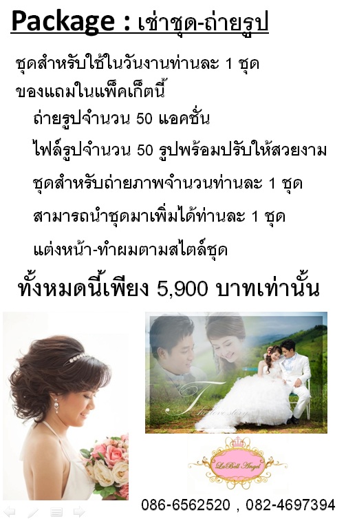 ตอนนี้ทางร้านมีโปรโมชั่นพิเศษ ถ่ายรูปพร้อมชุดในวันงาน เพียง 5,900 บาท ตามรายละเอียดดังนี้ ถ่ายรูป 50 แอคชั่น พร้อมให้ไฟล์รูปทั้งหมดที่ผ่านการแต่งรูปให้สวยงามด้วยช่างภาพมืออาชีพพร้อมอุปกรณ์ระดับโปร ฟรี ชุดสำหรับถ่ายถาพท่านละ 1 ชุด และสามารถนำชุดมาเพิ่มได้ท่านละ 1 ชุด ฟรี ชุดสำหรับใช้ในวันจริงอีกท่านละ 1 ชุด (ชุดไทย) ฟรี แต่งหน้าทำผมตามสไตล์ชุดที่ใส่ จำกัดเพียง 10 คู่เท่านั้น สามารถแวะชมผลงานได้ที่ http://www.facebook.com/#!/pages/LaBell-Angel/226783577424964