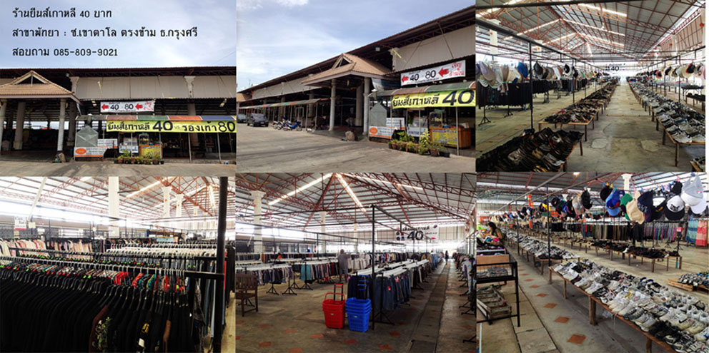 ขายเสื้อผ้า 40 บาท ทุกตัว และรองเท้า 80 ทุกคู่ และสินค้า จิปาถะ อีกมากมาย ปลีก-ส่ง เปิดบริการทุกวัน ตั้งแต่ 9.00 น. - 21.00 น. อยู่พัทยาใต้ ซอยเขาตาโล ตรงข้าม ธนาคาร กรุงศรี ตลาดเจริญทรัพย์ สอบถามโทร.085-809-9021 (มีหลายสาขา)