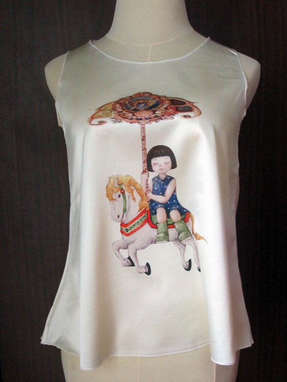 ชื่อสินค้า :เสื้อซาติน สกรีนลายน่ารัก แขนกุด สีครีม