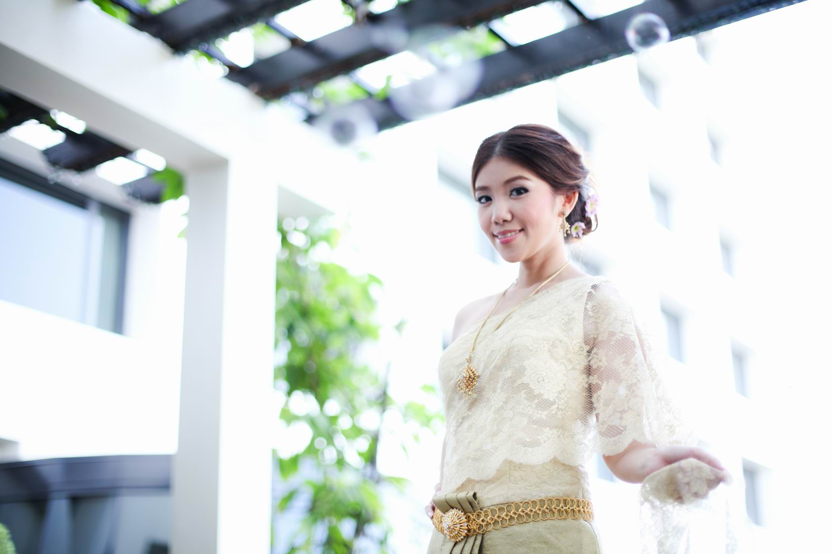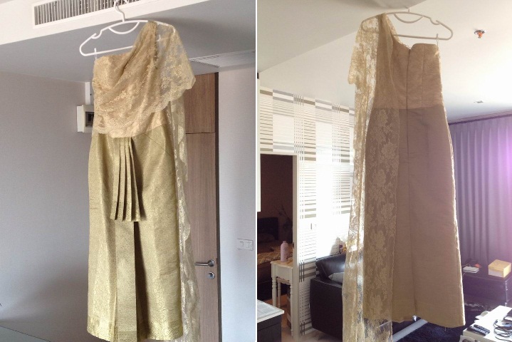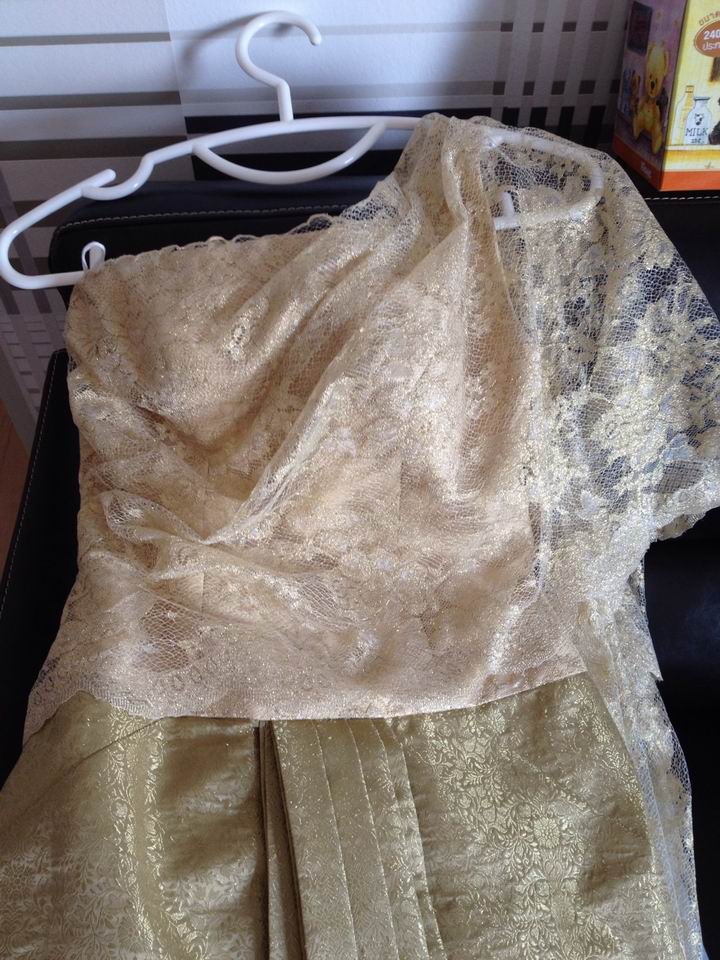 ตัวชุดเป็นแบบไทยประยุกต์จีบหน้าสีทองเหลือบเขียว ช่วงบนเข้ารูปพร้อมคลุมด้วยสไบลูกไม้สีทองยาวลากพื้นดูสวยเก๋ค่ ะ
