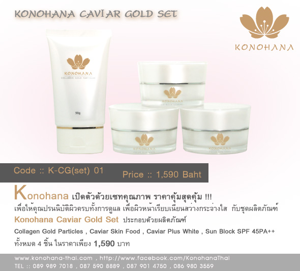 ชุดผลิตภัณฑ์บำรุงผิวหน้า Konohana Caviar Gold Set ชุดบำรุงผิวที่อุดมไปด้วย คุณค่าจาก อณูทองคำบริสุทธิ์ ซึ่งผ่านกระบวนการ Nano Technology จากประเทศ ญี่ปุ่น ช่วยกระตุ้น การสร้างคอลลาเจนและอิลาสติน กระตุ้นกระบวนการสร้างเซลล์ผิวใหม่ ฟื้นฟูผิวแห้งกร้าน ให้กลับเนียนนุ่ม ชุ่มชื้น ดูกระจ่างใส ผสานคุณค่าของอาหารผิว ที่สกัดจาก ไข่ปลาคาเวียร์ คุณภาพสูง อุดมไปด้วยคุณค่าทางโภชนาการ ที่มีส่วนประกอบอย่าง โปรตีน ที่ช่วยในการ กระตุ้น การเผาผลาญของเซลล์ผิวและให้ความชุ่มชื้นกับผิว วิตามินเอ,วิตามิน บี 1 บี 2 บี 6 วิตามินดีและอี ช่วยลบรอยหมองคล้ำ จุดด่างดำบนใบหน้า ปกป้องผิวให้ผิวสุขภาพดี เพิ่ม ออกซิเจนแก่ชั้นผิว ทำให้ผิวคืนความสดชื่น มีชีวิตชีวา ดูอ่อนเยาว์สดใส และ กรดอะมิโน แอซิด ที่ช่วยในการลด ลบเลือนริ้วรอย ร่องลึก อย่างได้ผล เพิ่มคุณค่าพิเศษด้วย คอลลาเจน และ SPF 45 ที่ช่วยคืนความยืดหยุ่นและลดริ้วรอยให้แก่ผิว เห็นผลอย่างรวดเร็ว ซ้ำยังเป็น เกราะปกป้องผิวจากรังสี UV และสภาวะภายนอกที่เป็นอันตรายกับผิว Konohana Caviar Gold Set จึงเป็นคำตอบเพียงหนึ่งเดียวที่ให้ครบทุกความต้องการของผิวของคุณ