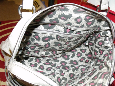 Vinyl embossed with 4G logo. Faux-leather trim. Shiny silver hardware. ? Front faux-leather plaque with logo. Top zip closure. ? Interior features a zipper pocket, cell phone pocket and two additional multipurpose pockets. Exterior zipper pocket. ? Dual top handles with 8" drop ? Cotton twill logo leopard-print lining ? 14 ½" W x 9 ¾"H x 6 ¼"D