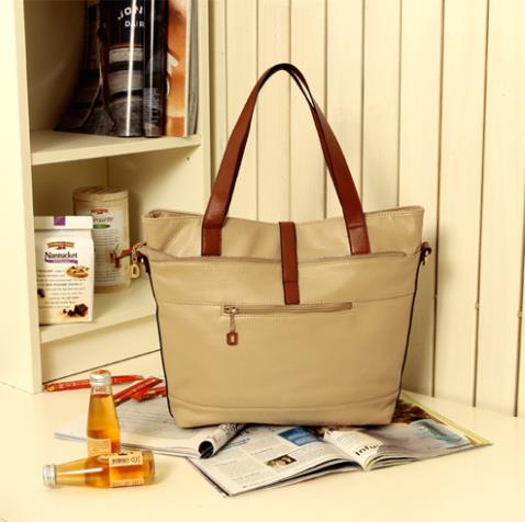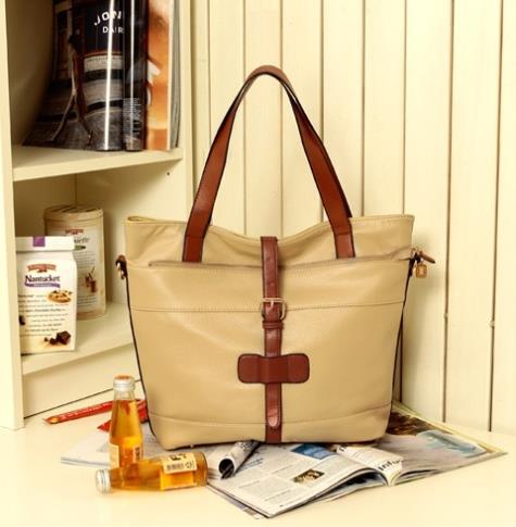 กระเป๋าถือพร้อมสะพายหนัง PU สีเบจ ขนาด : กว้าง 33 ซม. สูง 29 ซม. หนา 11 ซม. หูหิ้ว 19 ซม. สายยาว 125 ซม. ราคา 590 บาท