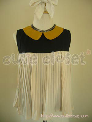 ยังคงแรงอยู่เรื่อยๆ กับเสื้อตกแต่งปกคอบัว ตัวนี้แพทเทิร์นเท่ห์มากๆ ค่ะ ปกคอบัวเป็นสีเหลืองมัสตาร์ด ตัดต่อผ้าเรียบๆ ช่วงอกและต่อผ้าชีฟองอัดพลีทช่วงใต้อก มีซับในนะคะ ไม่ต้องใส่อะไรด้านในแล้วค่ะ ซิบซ่อนด้านหลัง ตัวนี้แนะนำแมทช์กับกางเกงเอวสูง หรือ Riding Pants สีดำ รับรองว่าเกิดค่ะ อก ยืดได้ถึง 36" ยาว 22" http://www.cutiecloset.com/Products/productdetails.asp?category_id=1&product_id=200812242