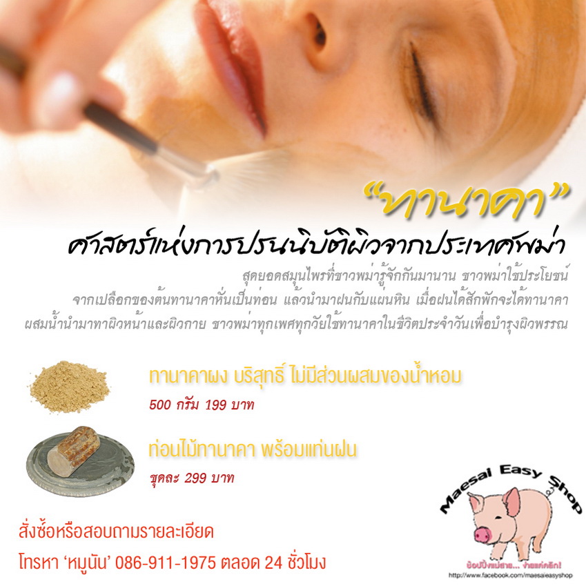 มีคุณสมบัติในการลดริ้วรอย และรักษาสิว สารพัดประโยชน์จริง ๆ คนพม่านำมาทาทั้งใบหน้า แขน ขา และทุกส่วนของร่างกาย เช่น บริเวณรักแร้เพื่อดับกลิ่นไม่พึงปรารถนา ผสมน้ำแต้มสิว และรอยแผลเป็นต่าง ๆ ทิ้งไว้ข้ามคืน หรือผสมน้ำทาแก้ผดผื่นคันให้เด็ก ๆ เรียกได้ว่าเป็นยาประจำบ้าน มากประโยชน์จริง ๆ