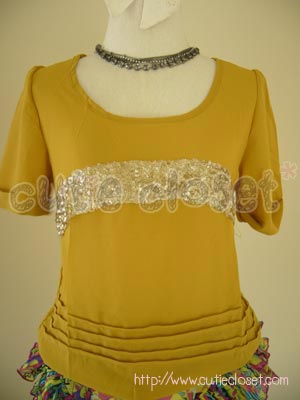 ชอบเสื้อตัวนี้ค่ะ ลงตัวทั้งแพทเทิร์นและสี ทำจากผ้าชีฟองเนื้อทราย คอกลมแขนตุ๊กตา ตกแต่งเลื่อมที่ช่วงอกและจับจีบที่ชายเสื้อ ตัวนี้ไม่บางมากค่ะ ใส่กับกางเกงหรือกระโปรงเอวสูง หรือกางเกงยีนส์ทรงสวยๆ ซักตัวก็เก๋ค่ะ อก ยืดได้ถึง 36" ยาว 22.5" http://www.cutiecloset.com/Products/productdetails.asp?category_id=1&product_id=200811878