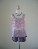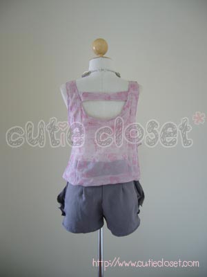 น่ารักแบบคุณหนูๆ กับเสื้อกล้ามผ้าชีฟองสีชมพูปริ้นท์ลาย ตัวนี้แพทเทิร์นสไตล์แบรนด์ดัง เก๋ๆ เพราะด้านหน้ามีระบายและปลายเสื้อเป็นหยักๆ กุ๊นขอบ ด้านหลังน่ารักมากๆ ค่ะ จะใส่ปล่อย หรือใส่กับกางเกงเอวสูงก็สวยกว่าใคร ได้ลุคหวานมากๆ เลยค่ะ เสื้อสวยๆ แบบนี้ พลาดไม่ได้นะคะ อก ยืดได้ถึง 34" ยาว 23" http://www.cutiecloset.com/Products/productdetails.asp?category_id=1&product_id=200811566
