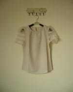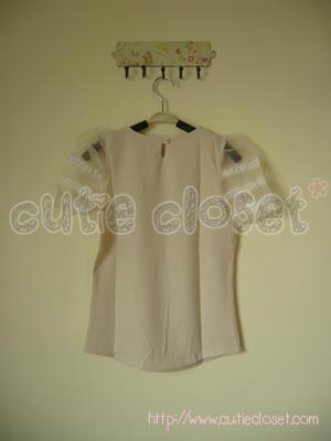 เสื้อตัวนี้ทำจากผ้าเนื้อทรายที่ค่อนข้างหนาแต่ระบายอากาศได้ดี แพทเทิร์นเรียบหรูสไตล์คุณหนู คอเสื้อเป็นแบบคอกลมจับจีบ เก๋ที่แขนตกแต่งด้วยผ้ามุ้งและริบบิ้น ตัวเสื้อเป็นแบบพอดีตัวนะคะ ใส่กับกางเกงเอวสูงรับรองว่าเริ่ดกว่าใคร เก๋ๆ ด้วยกระดุมติดคอหนึ่งเม็ดด้านหลัง ตัวนี้คุณภาพดีเกินราคาค่ะ อก ยืดได้ถึง 34" ยาว 22.5" http://www.cutiecloset.com/Products/productdetails.asp?category_id=1&product_id=200812210