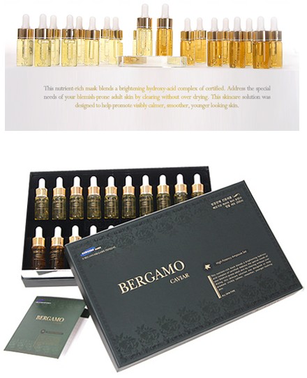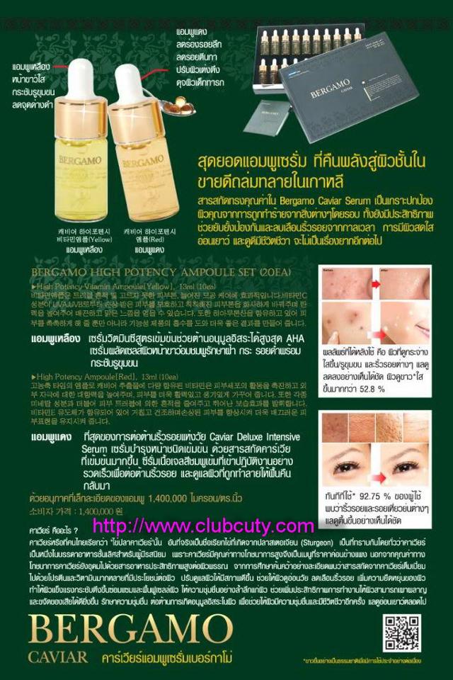 2. Bergamo Caviar Serum ขวดสีแดง High Potency Ampoule [Red] 13 ml. (1ea) เป็นแอมพูเข้มข้น มีวิตามินเข้มข้นที่อยู่ในสารสกัดจากไข่ปลาคาเวียร์ กระตุ้นให้เซลล์ผิวทำงานได้ดี และสร้างภูมิต้านทานต่อการระคายเคืองจากภายนอก ช่วยให้ผิวมีชีวิตชีวาและเปล่งปลั่งเหมือนผิวของเด็กทารก และปรับริ้วรอยแผลที่เกิดจากหลุมสิวให้เรียบเนียนสว่างขาวใสด้วยธาตุแร่ต่างๆจากไข่ปลา