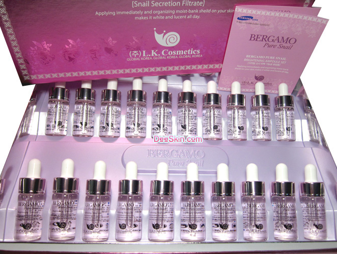เซรั่มเข้มข้นสูตรพิเศษ ให้ใบหน้ากระจ่างใส ลดเลือนจุดด่างดำ รอยแดงจากสิว ด้วยส่วนผสมของสารสกัดจากเมือกหอยทาก ให้สีผิวสม่ำเสมอ ฟื้นฟูเซลล์ผิวที่เสียหายจากสภาวะแวดล้อมต่างๆ เช่น แสงแดด รังสียูวี มลภาวะ ความเครียด ที่ส่งผลต่อผิวพรรณ ราคาขวดละ 170 บาท ถ้าซื้อเป็นกล่องๆละ 2500 บาท(ใน1กล่องมี20คู่)