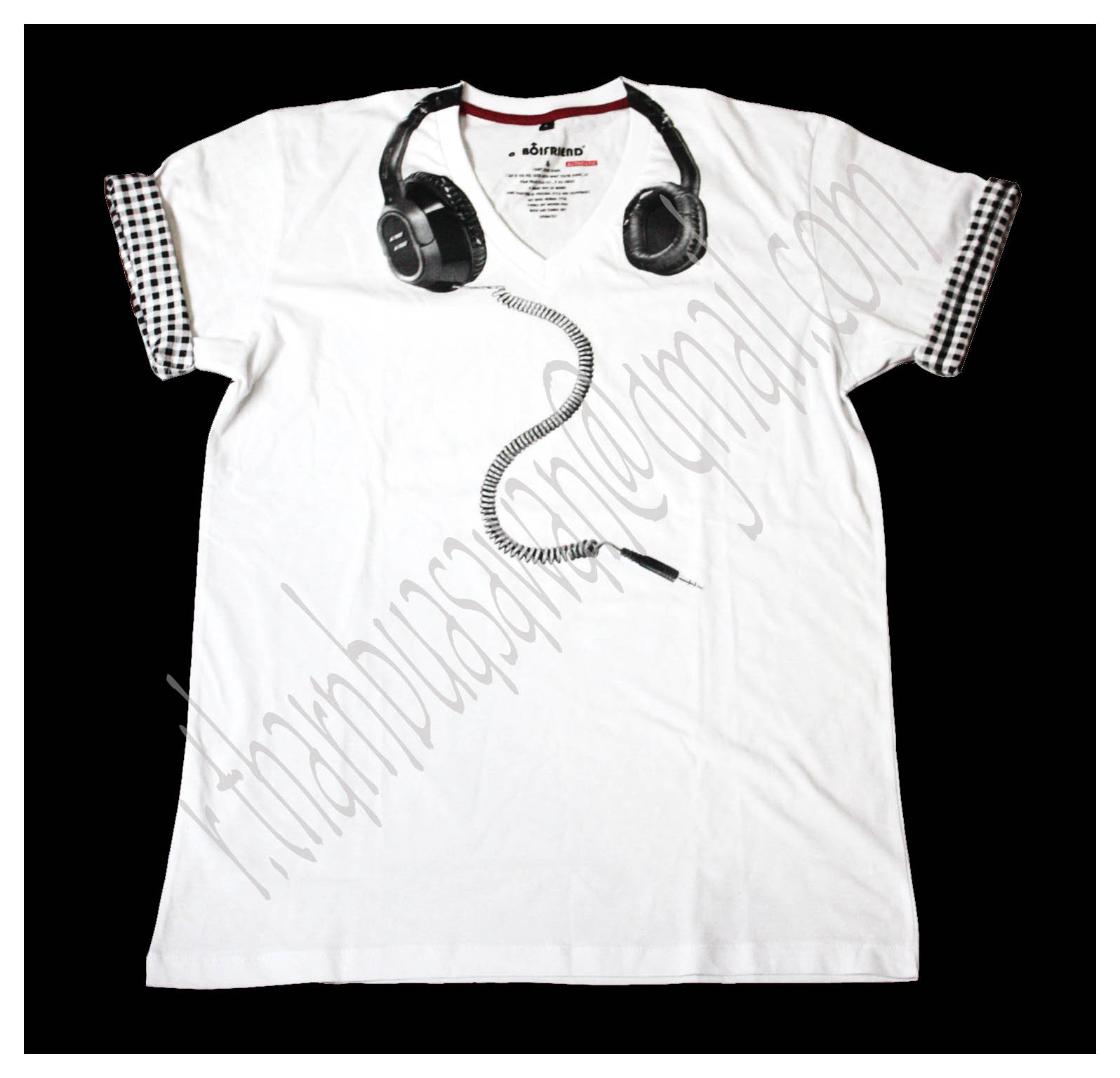เสื้อยืดสีขาว ลาย Headphone ยี่ห้อ Boifriend แขนเสื้อมีลายสก๊อตด้านในเวลาพับขึ้นจะเห็นลาย เหลือ size M และ L อย่างละตัวเท่านั้น