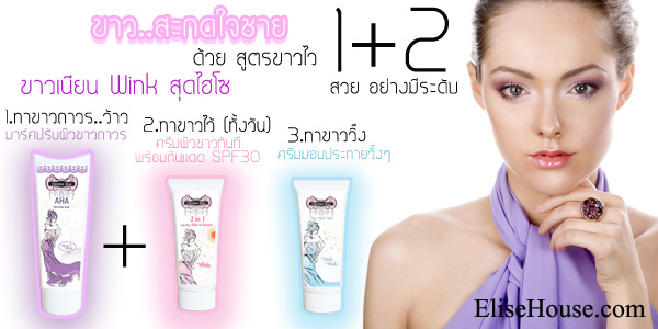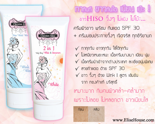 Set ผิวขาวถาวร ผลิตภัณฑ์มีทั้งหมด3ตัวน่ะค่ะ 1. AHA Hiso Body Mask มาร์ค ปรับผิวขาวถาวร สุดไฮโซ มาร์คผิวขาวอันดับ 1 ที่คุณสาวๆไม่ควรพลาด ด้วยสูตรลับของ Christien Elise ที่จะปรนนิบัติผิวของคุณให้ขาวเนียนขึ้น ใสขึ้น ในทุกๆครั้งที่ใช้ เพียงแค่มาร์คตัว 20 นาที/ครั้ง รับประกัน 100% ว่า ขาวขึ้น ขาวถาวร แน่นอนค่ะ... 1. ผิวขาว เนียน ใสขึ้น ดูดี 2. ผิวชุ่มชื้้น ดูสุขภาพดี ขาว ไฮโซ 3. จุดต่างดำจางลงไป ปรับสีผิวให้ขาวสม่ำเสมอกัน 4. รอยแตกลายงา จางลงไป 2. 2 in 1 Body Shiny White & Sunscreen ครีมผิวขาว พร้อม การปกป้องด้วยสารกันแดด SPF 30 ขาวเนียน….. ไฮโซ ไม่แป้ง ไม่เว่อร์ ไม่โบ๊ะ เนื้อครีมบางเบาเป็นพิเศษ เนียน นุ่ม ไม่เหนียวเหนอะหนะ เนื้อครีมนำเข้ามาจากต่างประเทศ ซึ่งนอกจากจะทำให้ผิวขาวเนียน ไฮโซแล้ว คุณสาวๆ ยังสามารถใช้ทาแทนครีมกันแดดได้อีกด้วย เพราะมีการปกป้องเป็นพิเศษด้วยสารกันแดด SPF 30 พร้อมบำรุงผิวให้สวยปิ๊ง ด้วยสารสกัดจากธรรมชาติ 3. Hiso Wink Wink ครีมมอบประกายวิ๊งๆ ดุจ สาวในสังคมชั้นสูง ครีมทาผิว เพื่อเพิ่มประกายขาว วิ๊งๆให้กับผิวของสาวๆ โดดเด่นยิ่งกว่าใคร เนื้อครีมคุณภาพ เนียนนุ่ม ละเอียดเป็นพิเศษ ที่ได้รับการพัฒนา จากผู้เชี่ยวชาญเฉพาะด้าน ใช้แล้วจะติดใจ Contact Christien Elise : Tel + Whatapp 085-8383-931