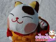 ขายตุ๊กตาแมวนำโชค (มาเนะคิเนะโกะ) สวมชุดโชกุน นั่งบนหมอน ทำจากผ้ากิโมโน ยกมือซ้ายกวัก สูงประมาณ 14.5 ซ.ม. กว้างประมาณ 11 ซ.ม.