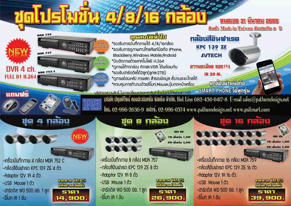 ชุดโปรโมชั่น 4/8/16 กล้องสีอินฟาเรด พร้อมเครื่องบันทึกภาพ และของแถมอีกมากมาย ในราคาสุดคุ้ม สะดวกรวดเร็วดูภาพสดๆผ่านมือถึอ iphone /BB /windows mobile /Andoid ได้