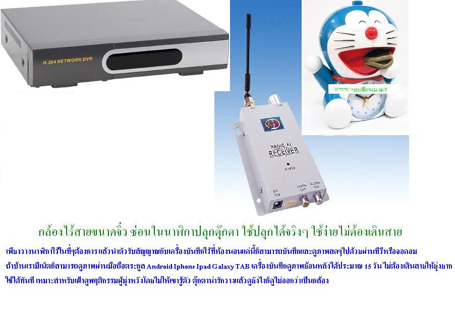 เพียงวางนาฬิกาไว้ในที่ๆต้องการ แล้วนำตัวรับสัญญาณกับตัวบันทึกไว้ที่ห้องนอนแค่นี้ก็สามารถบันทึกและดูภาพสดๆผ่านทีวี หรือ จอคอม ถ้าไม่อยู่บ้านก็สามารถดูภาพย้อนหลังได้หลังจากกลับมา สามารถดูภาพย้อนหลังได้ประมาณ 15 วัน ถ้าที่บ้านมีเน็ตก็สามารถดูผ่านเน็ตโดยใช้เครื่อง PC ,NoteBook, IPhone,IPad,Galaxy TAB,Android Mobile Phone or etc. นาฬิกาปลุกเป็นตุ๊กตาน่ารักดูยังไงก็ดูไม่ออกว่าเป็นกล้อง เหมาะสำหรับเฝ้าดูพฤติกรรมของผู้มุ่งหวังโดยไม่ให้เขารู้ตัว สินค้ารับประกัน 1 ปีเต็ม